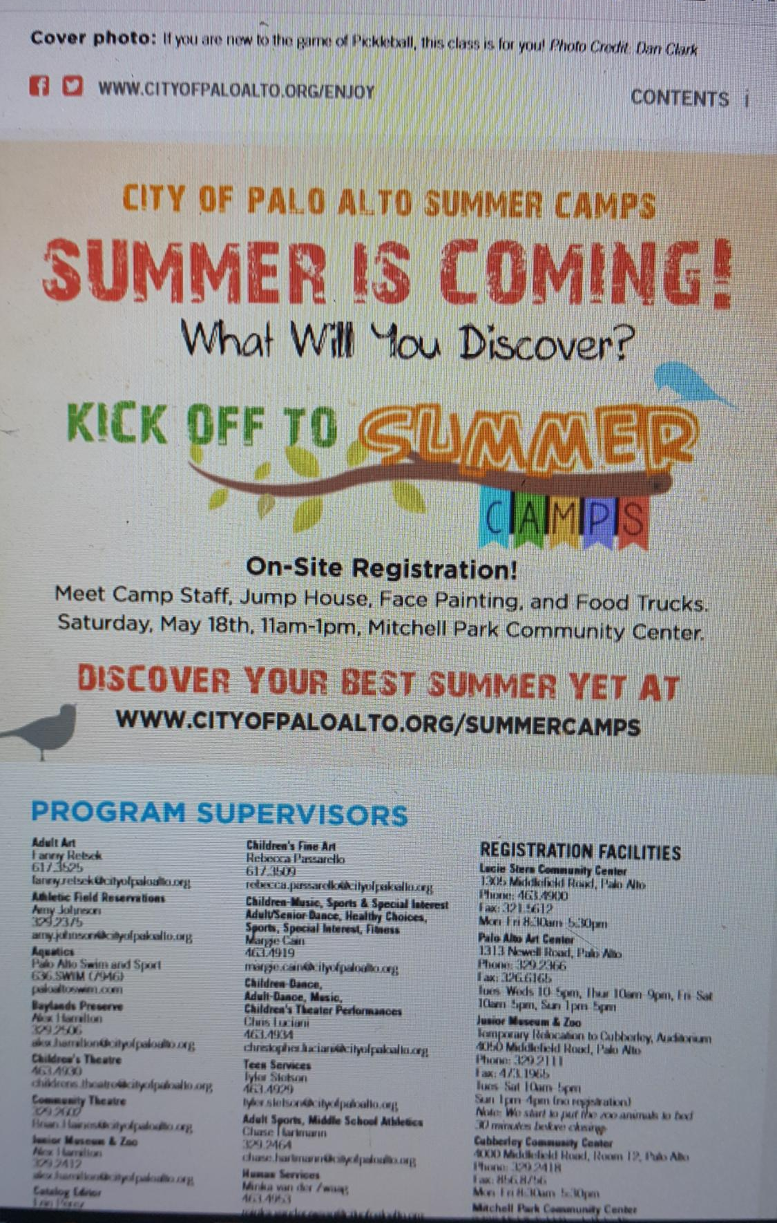팔로알토의 경우 cityofpaloalto.org/enjoy에서 팔로알토 내의 대부분의 서머캠프(summer camp)를 안내하고 있습니다. 기본적인 저렴한 썸머캠프부터 사립학교에서 운영하는 고급 서머캠프까지 대부분의 정보가 있습니다.