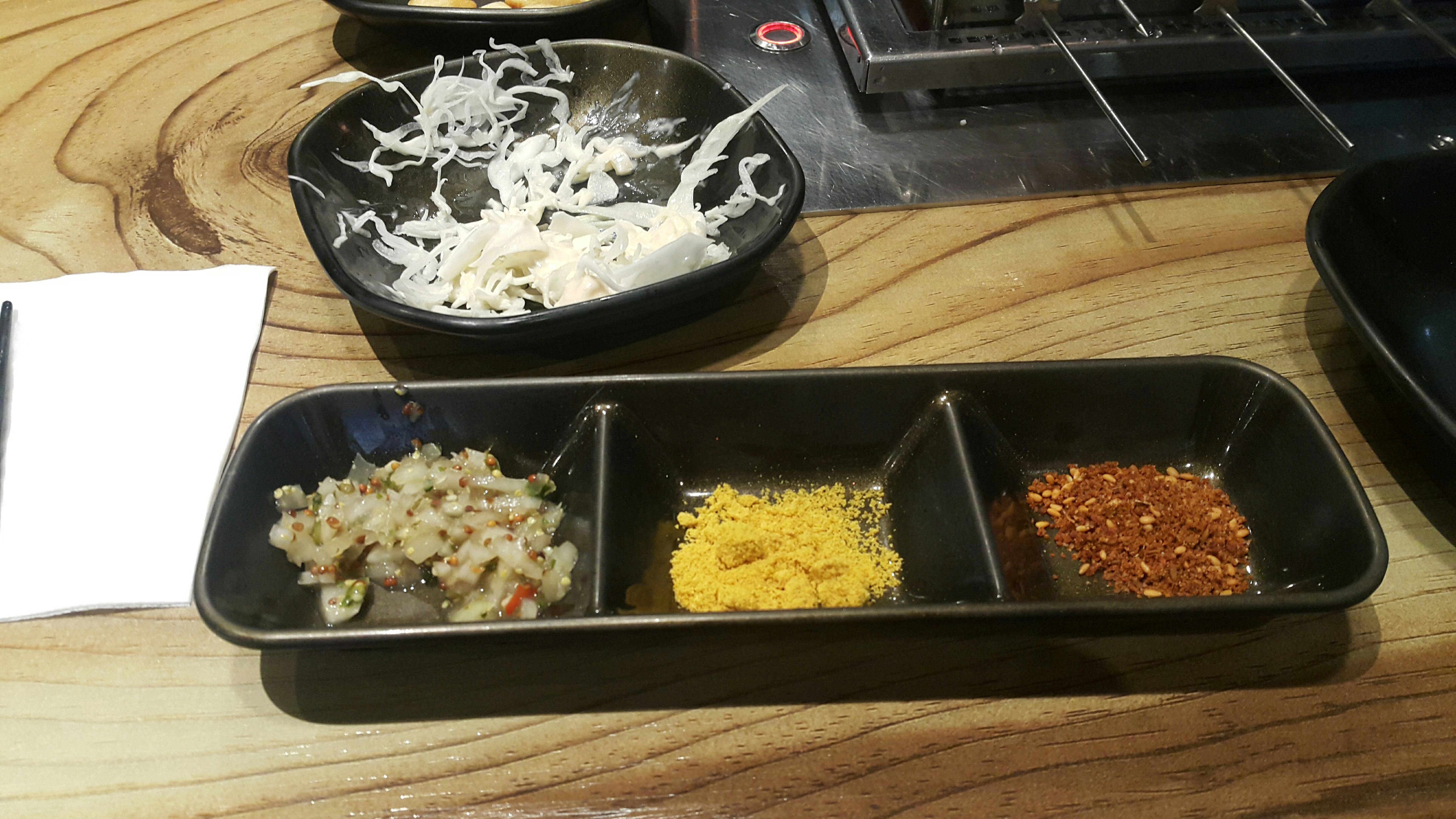 소스는 3 가지 맛.... 피클 다진 소스, 강황가루, 매운맛 양꼬치 기본 소스